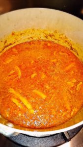 そして、先ほど、じっくりと煮込んだ渡り蟹のエキスを紅ズワイガニの鍋に投入して、またじっくりと煮込みます。