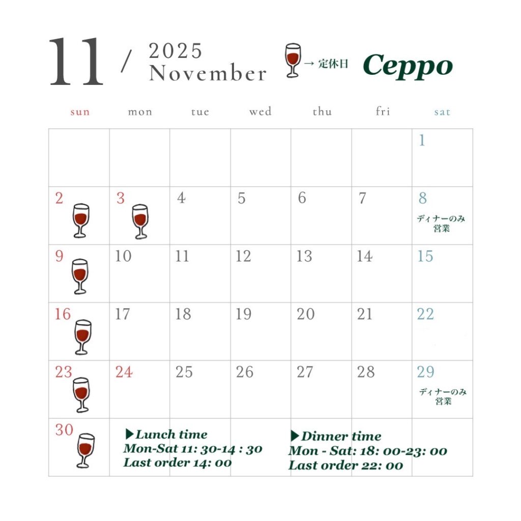 11月の定休日は、2(日)、3(月)、9(日)、16(日)、23(日)、30(日)になります。