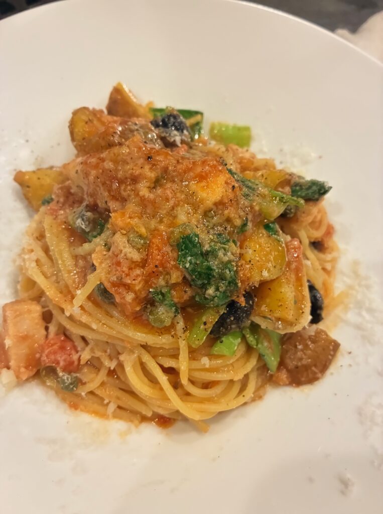 そして、この時期においしい新じゃがいもを使用して、オリーブ、ケッパー、トマトで心地の良い酸味と野菜の甘味がおいしいパスタに仕上げております。